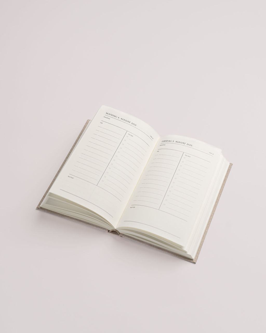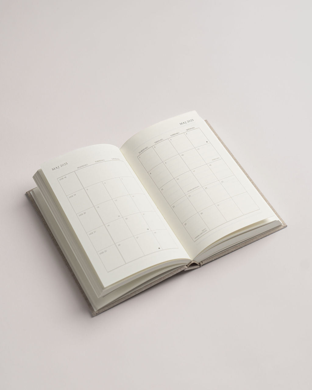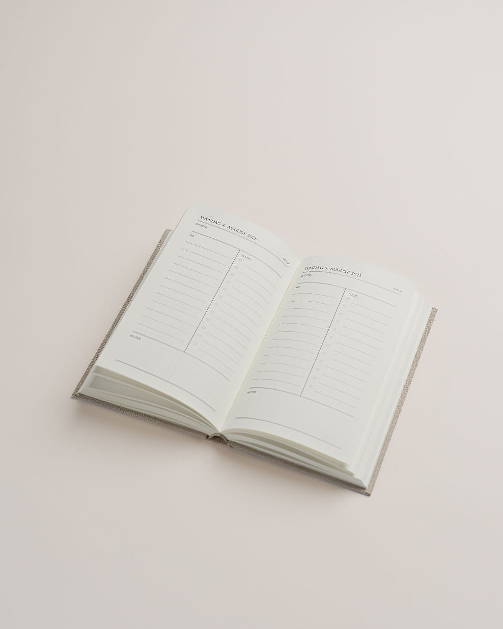 Atelier Aarhus dagskalender kan let tilpasses dit personlige behov. Den er til dig, der ønsker at samle to do-lister, aftaler og tanker. Dagskalenderen dækker januar - december 2025 med én dag per side (fælles side til weekenddagene). Designet samler dine kort- og langsigtede planer og har plads til alt fra månedens drømme og intentioner til dagens huskelister.