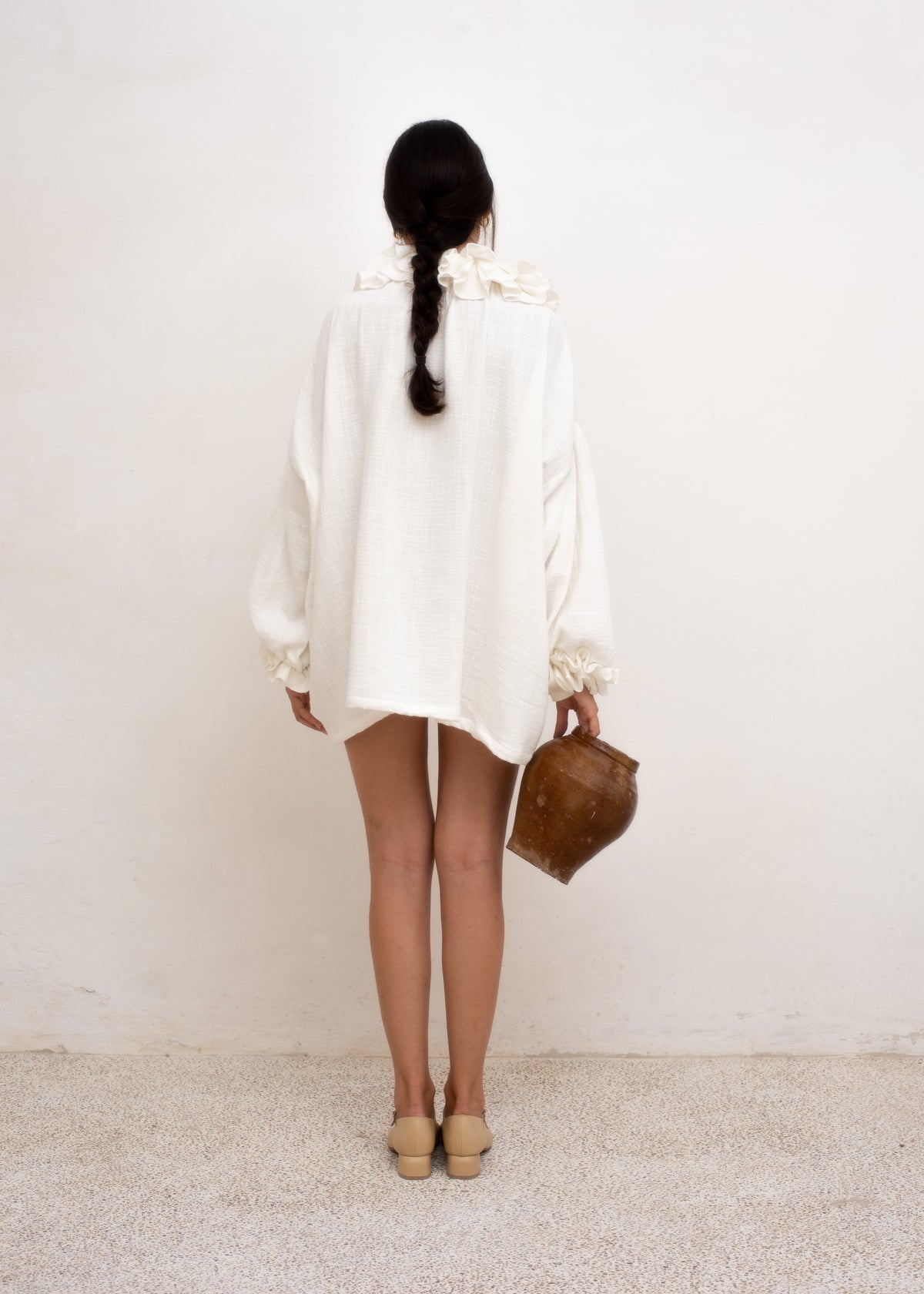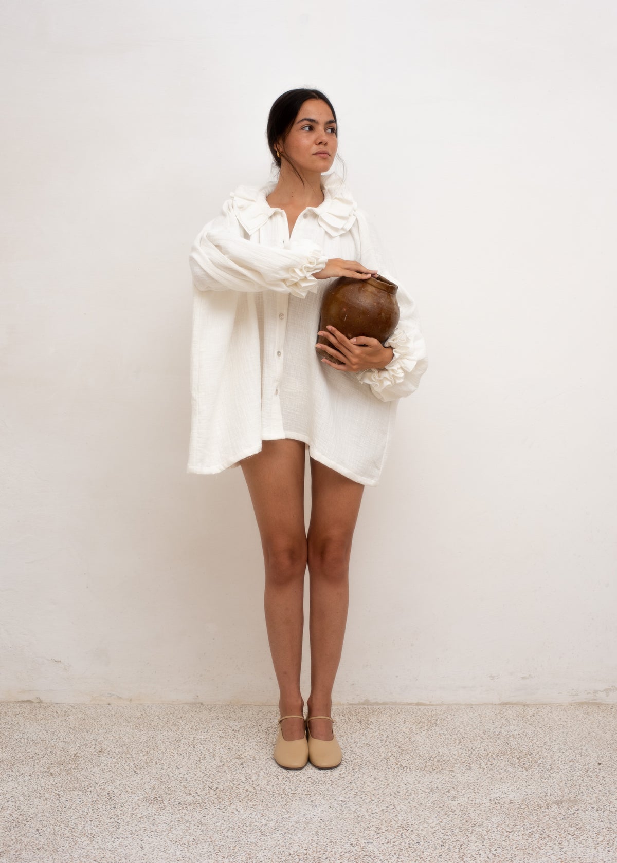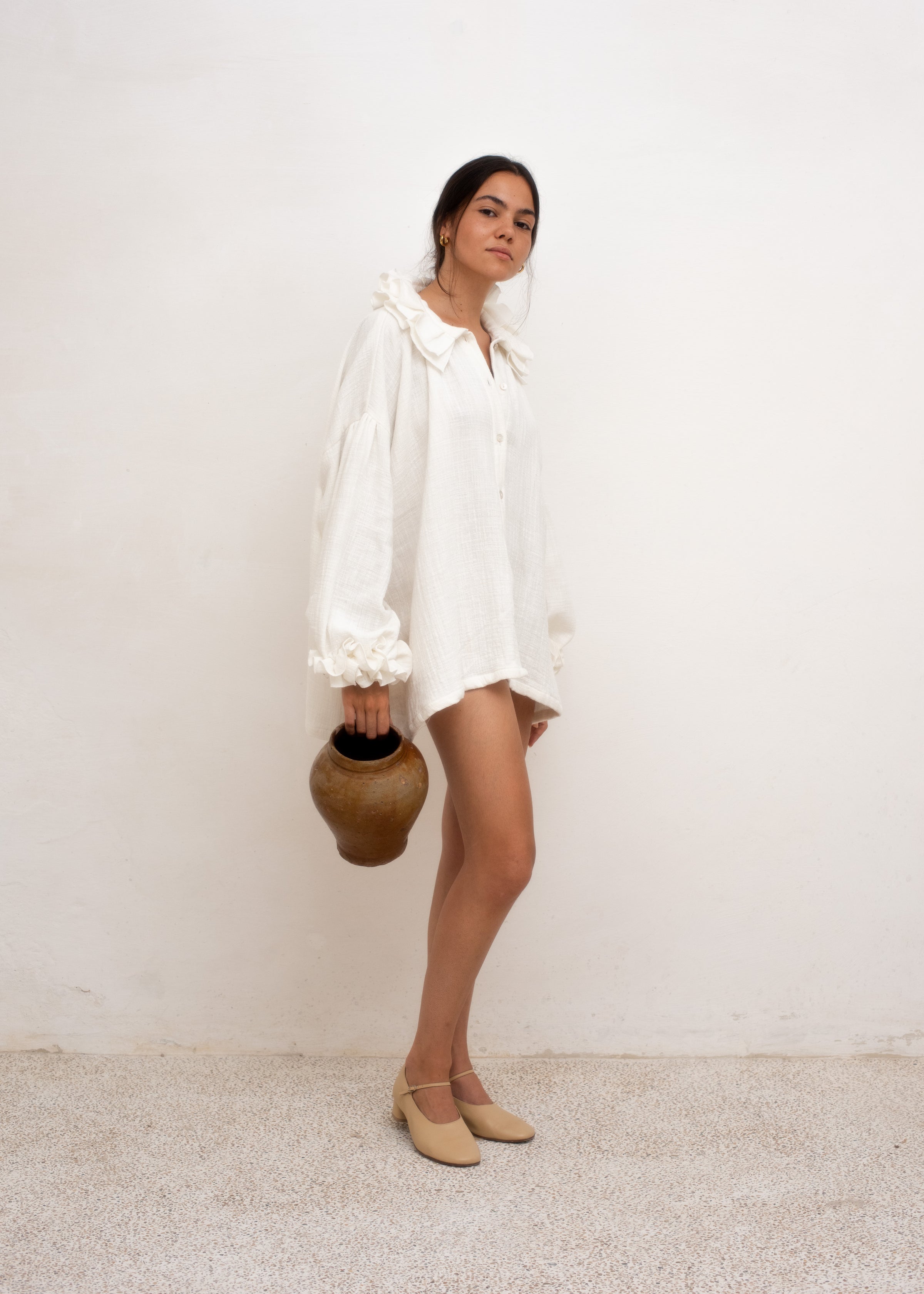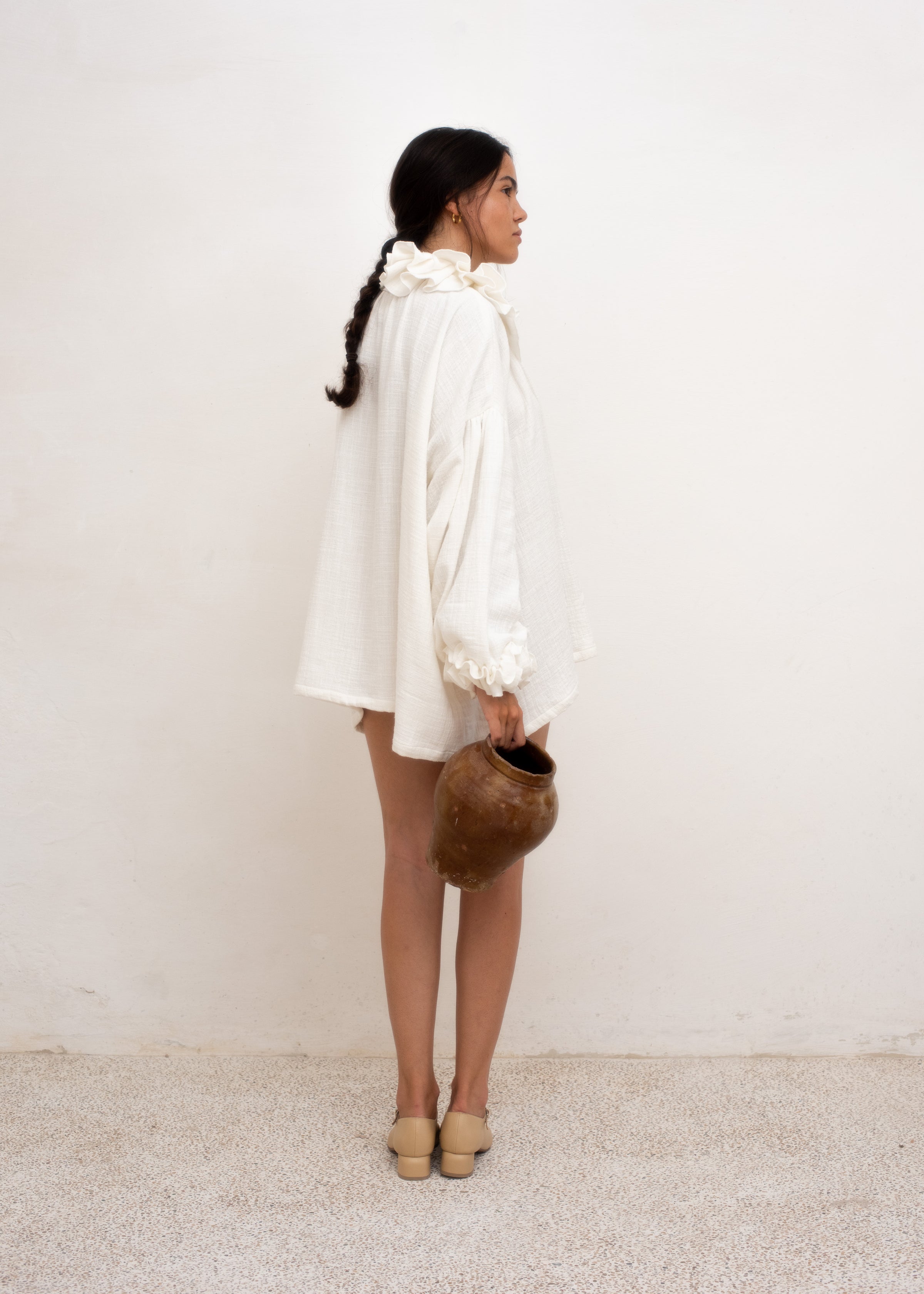 A timeless and elegant look, designed to perfectly match all-year-round fit. Made from 100% soft and flowy organic cotton, featured with a unique ruffle collar and long sleeve for effortless style and comfort.